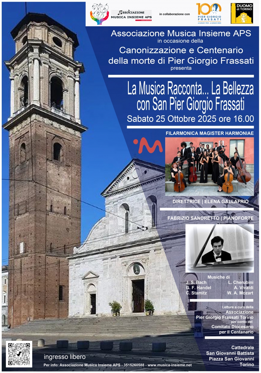 Un pomeriggio di musica e spiritualità nel cuore di Torino: l’Orchestra Filarmonica Magister Harmoniae dell’Associazione Musica Insieme APS di Grugliasco, presenta il concerto-evento La Musica Racconta… La Bellezza con San Pier Giorgio Frassati, in collaborazione con l’Arcidiocesi di Torino e il Comitato per il Centenario di Pier Giorgio Frassati.