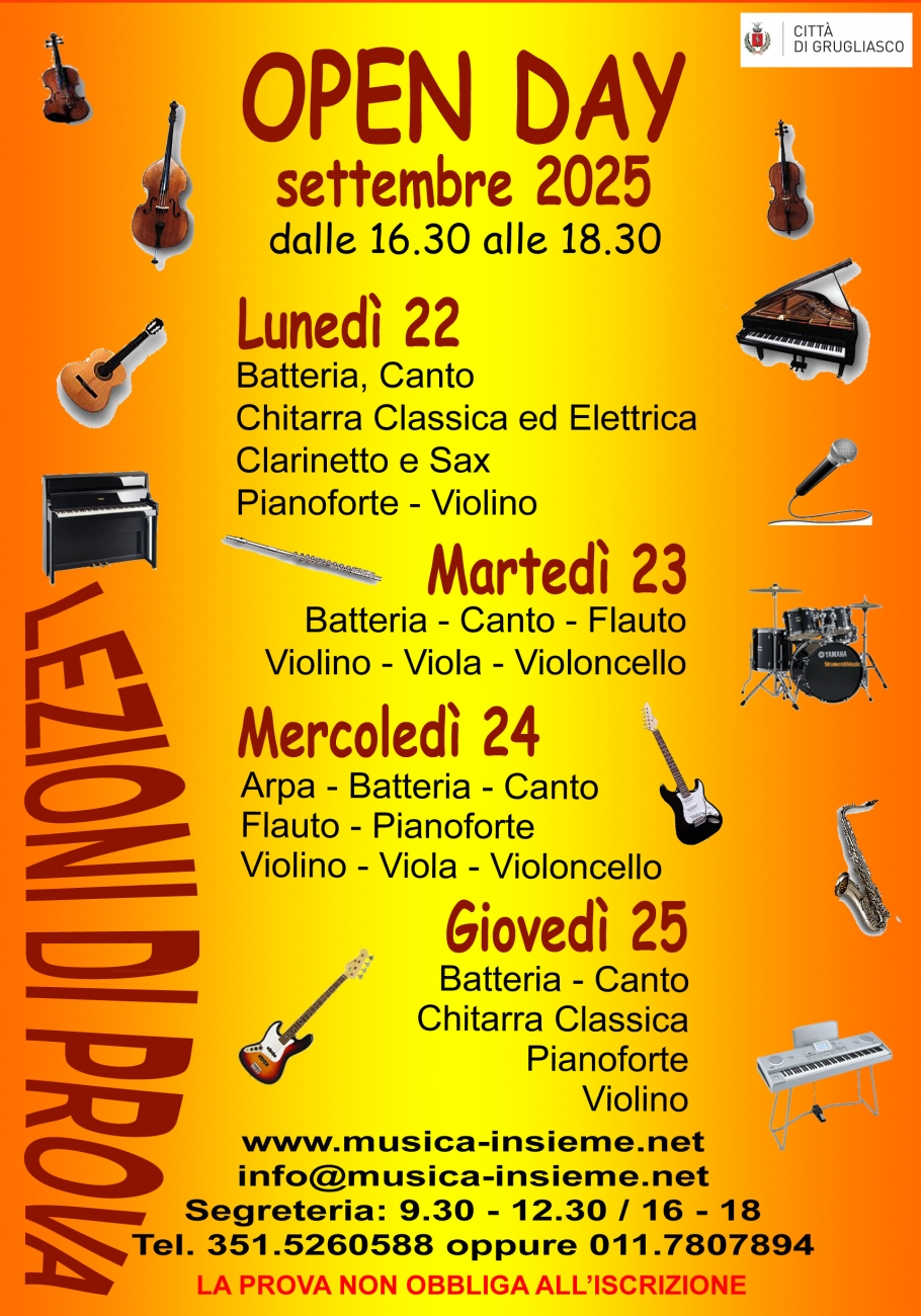 Nel prestigioso Parco Le Serre, sede dell'Associazione Musica Insieme APS di Grugliasco, all'interno della Palazzina "Casa Musica e Cultura Giuseppe Impastato", Docenti diplomati e certificati, saranno presenti ad accogliere chi fosse interessato a provare uno o più strumenti musicali.